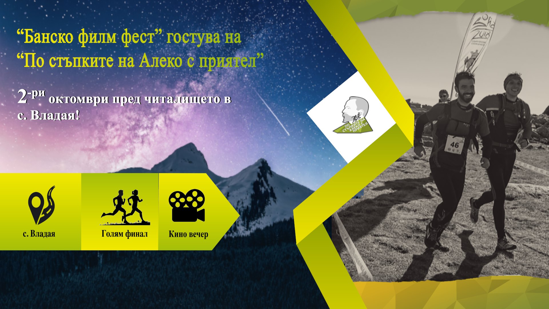 Владайско Читалище "Светлина - 1906" Владая, ул. "Войнишко въстание" 59Sofia,📽 "Банско филм фест" е един от най- големите филмови фестивали в света за планинарско и екстремно кино. 🏫 На 02.10.2021 г. ще гостува на централния площад в с. Владая пред читалището. 🏃♀️🏃🏽♂️Събитието е абсолютно безплатно и ще започне в 18:00 ч. и е част от празничната програма на най-голямото изцяло отборно състезание по-планинско бягане